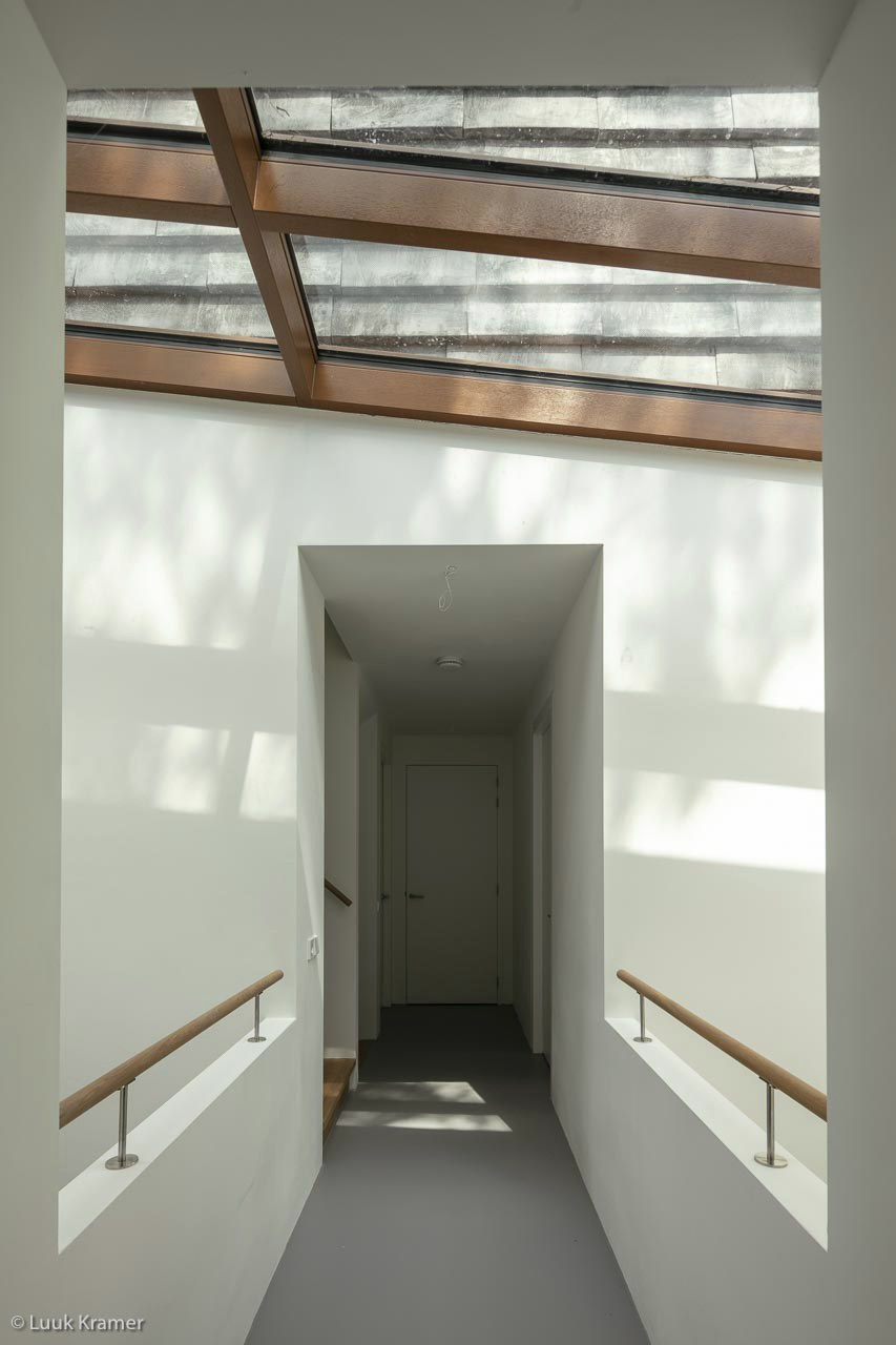 De twee hoge volumes bieden ruimte aan de woning zelf en worden gescheiden door een volledig doorgetrokken lichtstraat. In deze lichtstraat bevindt zich de entree en een loopbrug die de volumes verbindt. De twee lagere volumes bieden ruimte aan de garage en berging. De verbindende luifel zorg voor voldoende ruimte om overdekt te parkeren en biedt ruimte aan de entree en een overdekt terras.